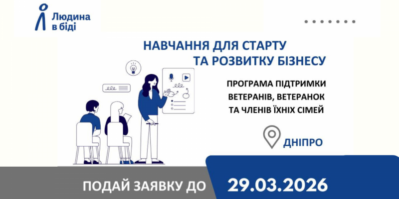 Маєте ідею для бізнесу, але не знаєте, де взяти кошти? Запрошуємо ветеранів, ветеранок та членів їхніх родин у Дніпрі на безоплатну навчальну програму, що реалізується чеською гуманітарною організацією «Людина в біді» у партнерстві з БФ «Промприлад», ГО «Вільний вибір» та БФ «Суперлюди» за фінансової підтримки чеського народу