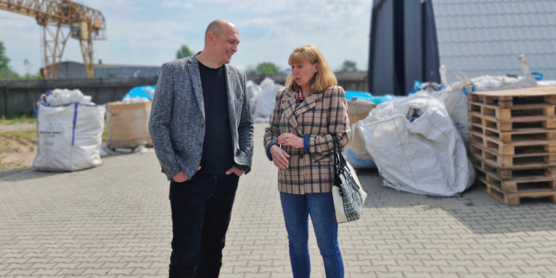 Начальниця фінансового управління Дніпропетровського обласного центру зайнятості Олена Голенко познайомилася з керівництвом ТОВ «Дніпровський завод упаковки» - черговим переможцем грантової програми для переробних підприємств, які незабаром отримають 8 мільйонів гривень на збільшення своїх потужностей