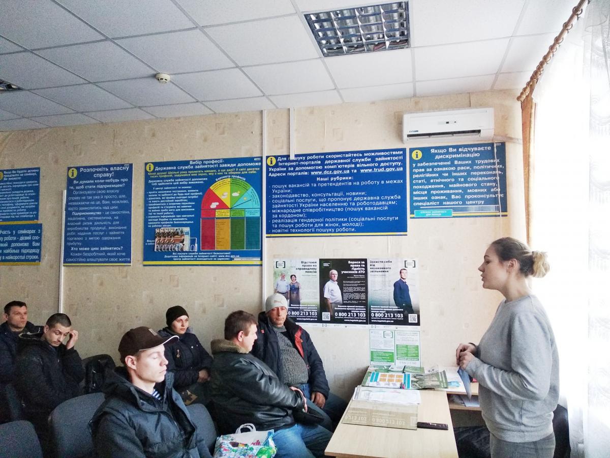 Заступник начальника сектору кадрового забезпечення Жовтоводського відділу поліції Олена Восьмак повідомила про оголошення конкурсу на заміщення вакантних посад, ознайомила безробітних із графіком роботи, рівнем заробітної плати та основними вимогами до кандидатів.