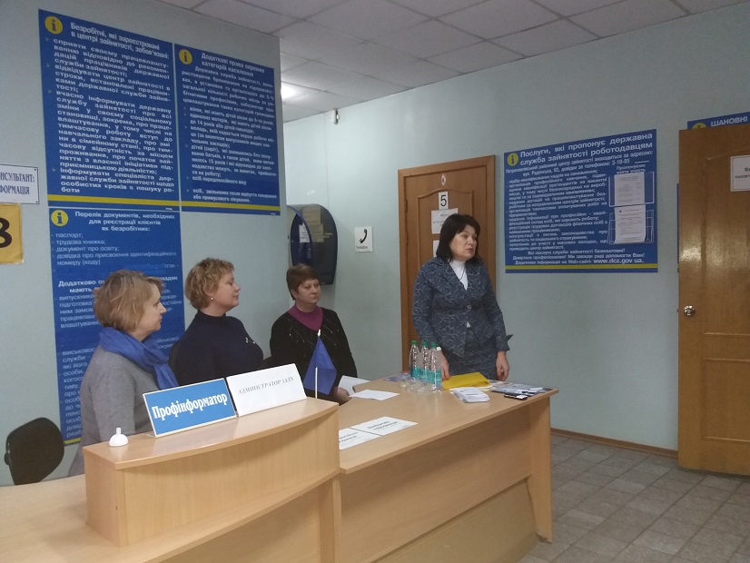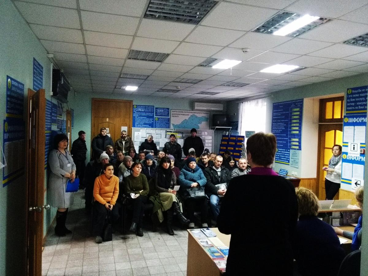 В рамках зустрічі 38 безробітних громадян дізнались про перспективи працевлаштуватись за робітничими професіями: електрослюсар підземний, машиніст підземних установок, гірник підземний, машиніст крана, стволовий.