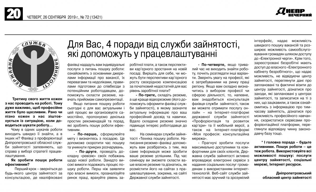 Газета «Днепр вечерний» від 26 вересня 2019 року № 72 (13421)