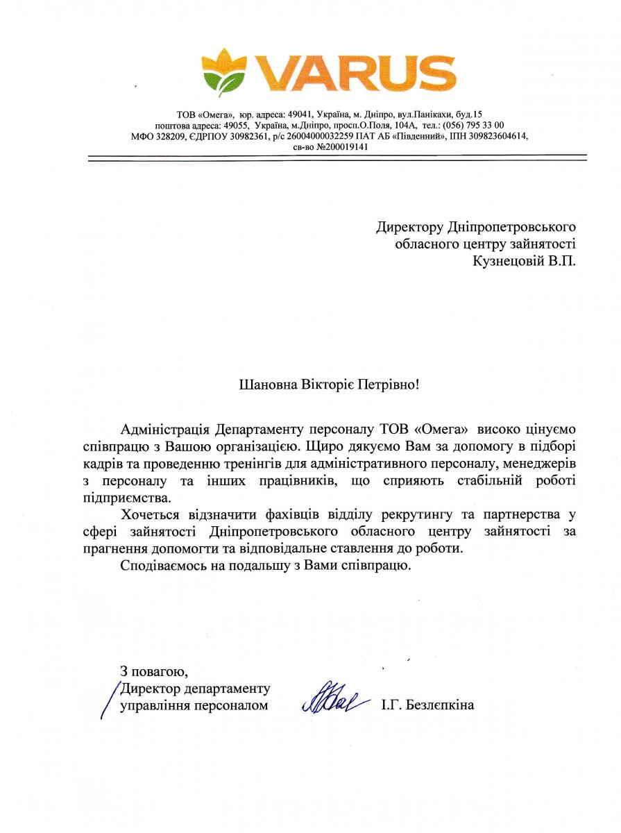 «Високо цінуємо співпрацю з вашою організацією та дякуємо за допомогу у підборі кадрів та проведенні тренінгів для адміністративного персоналу підприємства. Хочеться відзначити фахівців відділу рекрутингу та партнерства у сфері зайнятості Дніпропетровського обласного центру зайнятості за допомогу та відповідальне ставлення до роботи», – зазначає у листі директор департаменту управління персоналом ТОВ «Омега» Ірина Безлєпкіна.