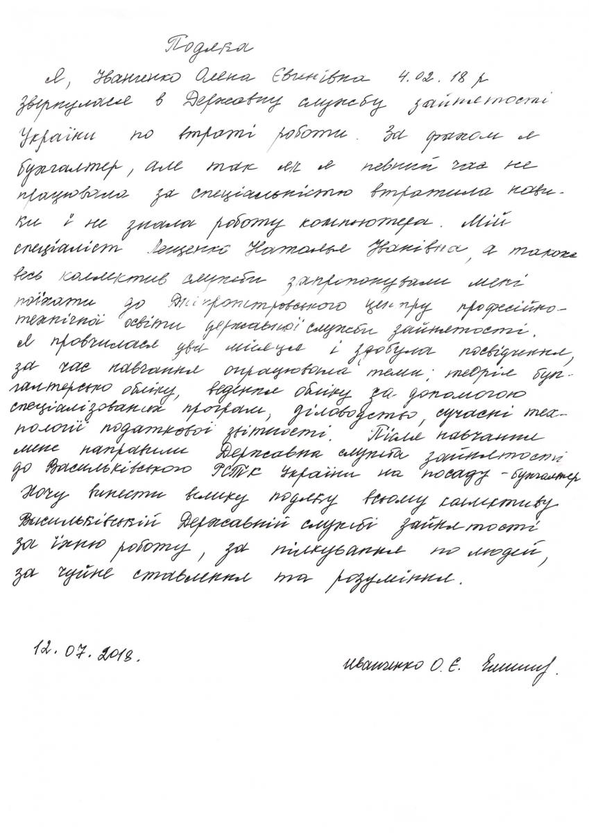 На даний час з ВАСИЛЬКІВСЬКИМ РСТК ТСО УКРАЇНИ заключено договір на працевлаштування Іванченко О. Є. на посаду бухгалтера після закінчення професійного навчання. Наразі жінка стала до роботи. Свої слова вдячності за отриману допомогу та підтримку Олена висловила у листі, що надійшов до Філії.