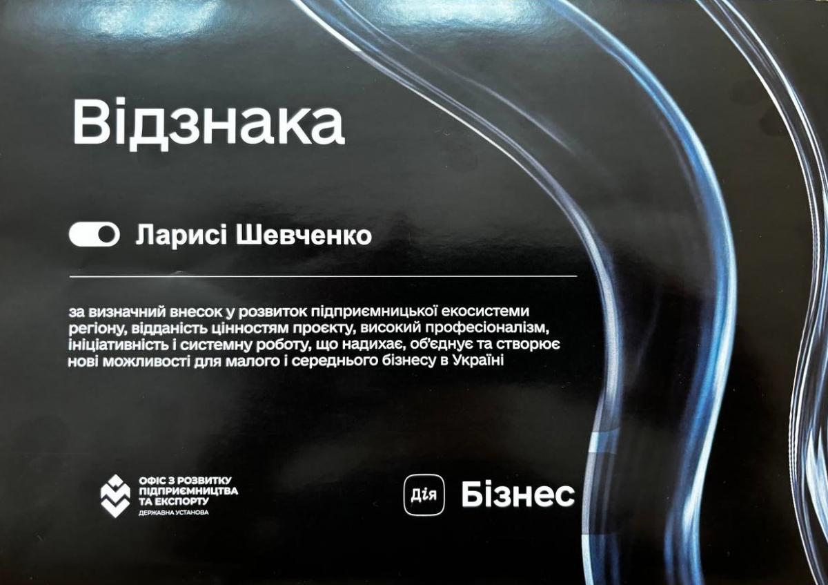 Учасників ярмарку відзначили нагородами «Дія.Бізнес» за вагомий внесок у розвиток підприємницької екосистеми регіону. Приємно, що Відзнаку від Міністерства цифрової трансформації за ініціативність та системну роботу отримала й Лариса Шевченко.