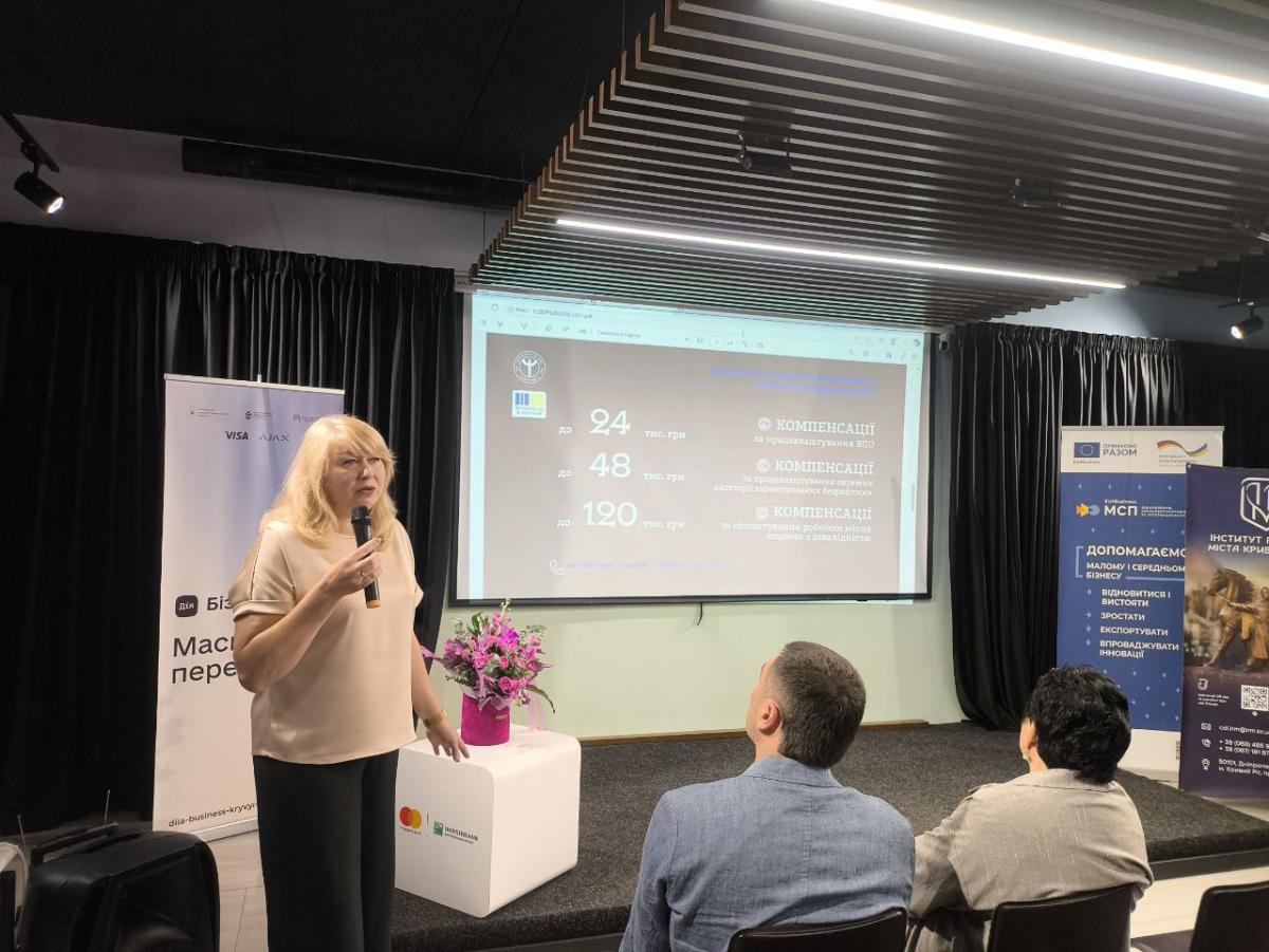 Для присутніх директорка Криворізької філії Дніпропетровського ОЦЗ Лариса Шевченко презентувала інструменти підтримки від служби зайнятості: гранти й мікрогранти для започаткування та розвитку власної справи, ваучери на навчання, а також компенсаційні програми для роботодавців.