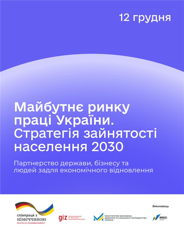 12 грудня Міністерство економіки, довкілля та сільського господарства України спільно з Офісом ефективного регулювання BRDO та GIZ Україна представить Стратегію зайнятості населення 2030 — програмний документ, що визначає рамку розвитку ринку праці до 2030 року.
