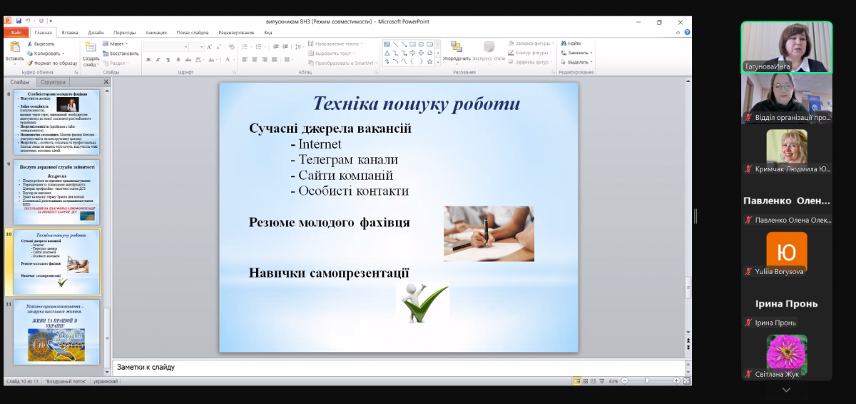 Леся Бабченко ознайомила з ресурсними можливостями сайту служби зайнятості, презентувала «Платформу з профорієнтації та розвитку кар’єри» та можливості отримання професійної консультації з питань професійної орієнтації онлайн.