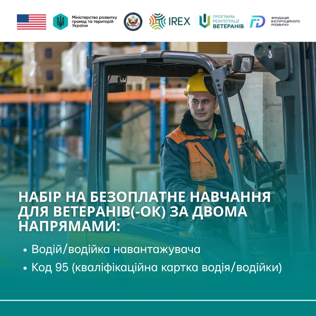 Проєкт «Залучення ветеранів до професій у сфері логістики» втілюється ГО «Фундація інституційного розвитку» у партнерстві з Міністерством розвитку громад та територій України за сприяння Програми реінтеграції ветеранів, що втілюється IREX за підтримки Державного департаменту США.