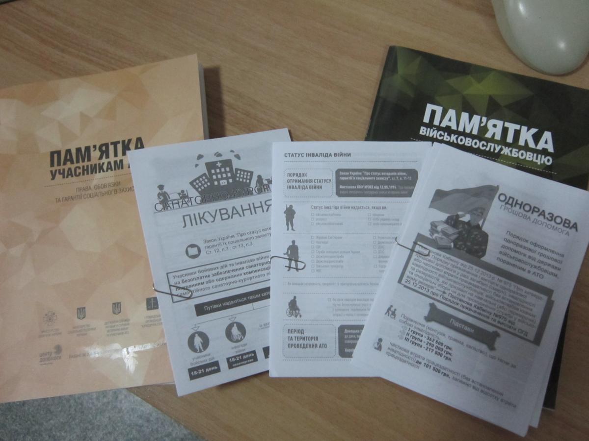 На завершення зустрічі присутнім було запропоновано інформаційні буклети: «Пільги учасникам бойових дій та особам прирівняним до них», «Дії позичальника мобілізованого та учасника АТО, який має зобов'язання по кредиту», «Дії незаконно звільнених учасників АТО», «Реалізація права учасників АТО на землю та житло», «Укладення та припинення контрактів військовими під час АТО», «Забезпечення учасників бойових дій ліками та лікарськими засобами», які в подальшому допоможуть їм зорієнтуватись щодо отримання необхідної правової допомоги.