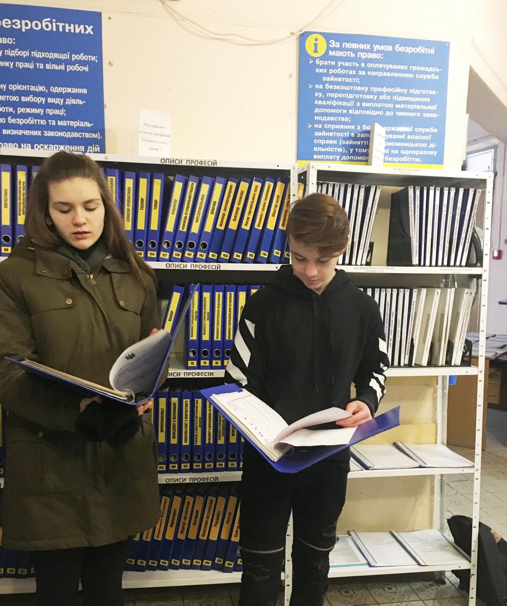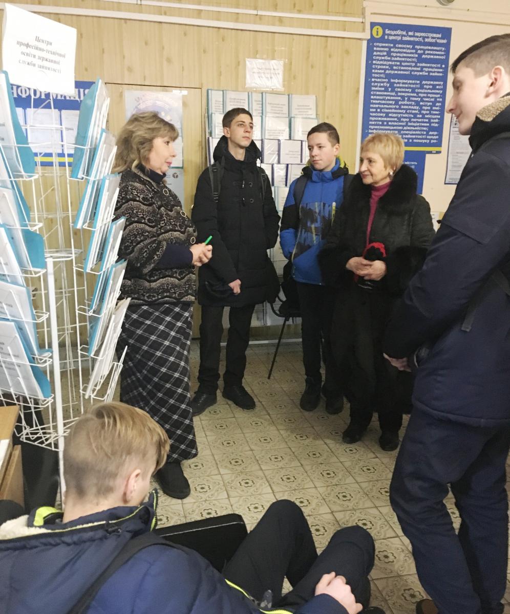 Фахівці Синельниківської міськрайонної філії Дніпропетровського обласного центру зайнятості провели оглядову екскурсію, під час якої школярі дізнались про історію служби зайнятості, соціальні послуги, які вона надає населенню, а також про ситуацію на ринку праці регіону та професії, що затребувані на підприємствах. Також діти дізналися про можливості отримання цих та інших професій у центрах професійно - технічної освіти Державної служби зайнятості та отримали корисні поради щодо правильного вибору професії.
