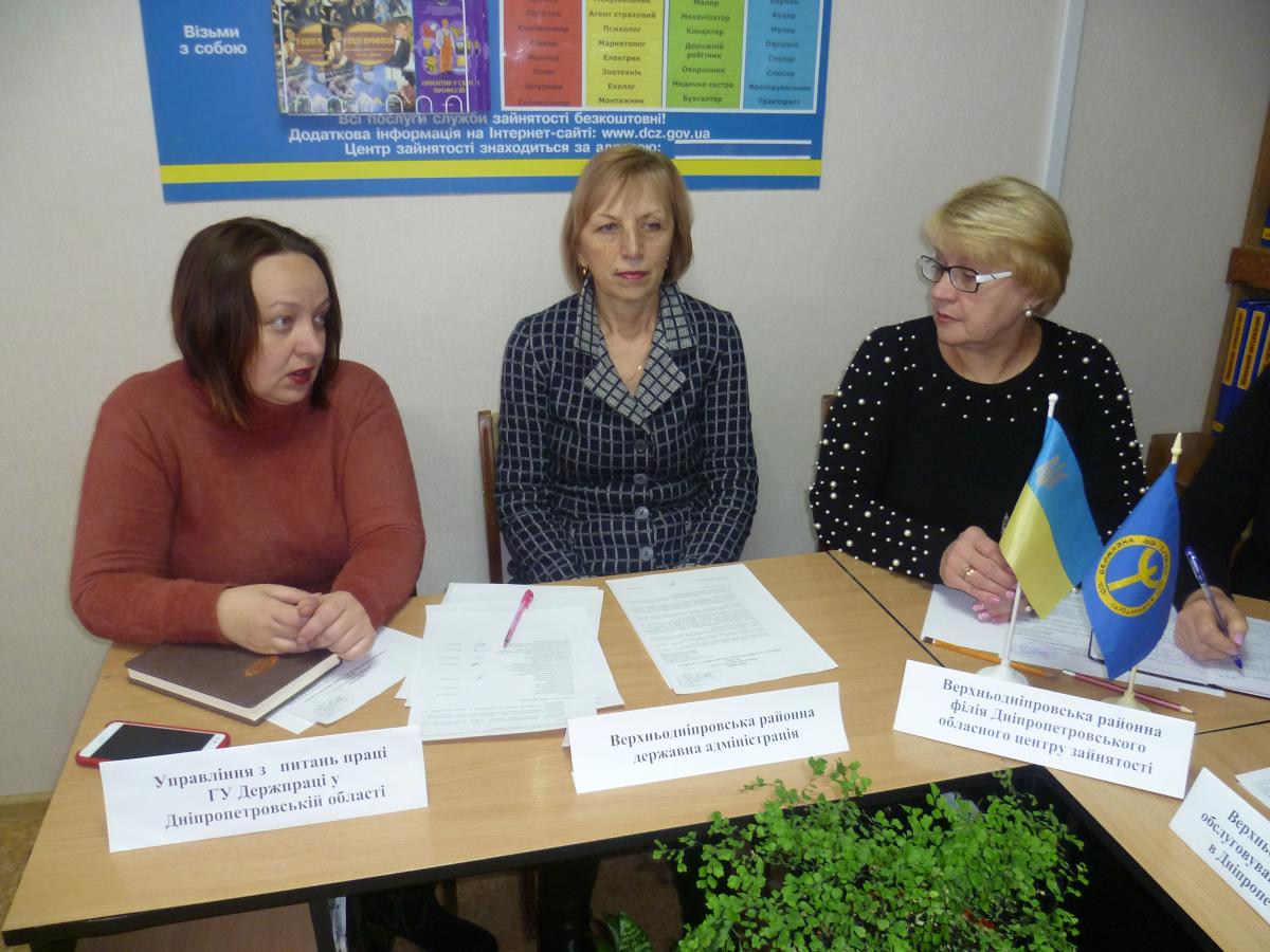 У засіданні взяли участь: головний державний інспектор відділу з питань додержання законодавства про працю у Дніпродзержинському регіоні Управління з питань праці Головного управління Держпраці у Дніпропетровській області Оксана Лапенко, начальник Верхньодніпровського відділу обслуговування громадян Головного управління Пенсійного фонду України в Дніпропетровській області Анна Білоус, начальник відділу соціально-трудових відносин Управління соціального захисту населення Верхньодніпровської райдержадміністрації Вікторія Вовк.