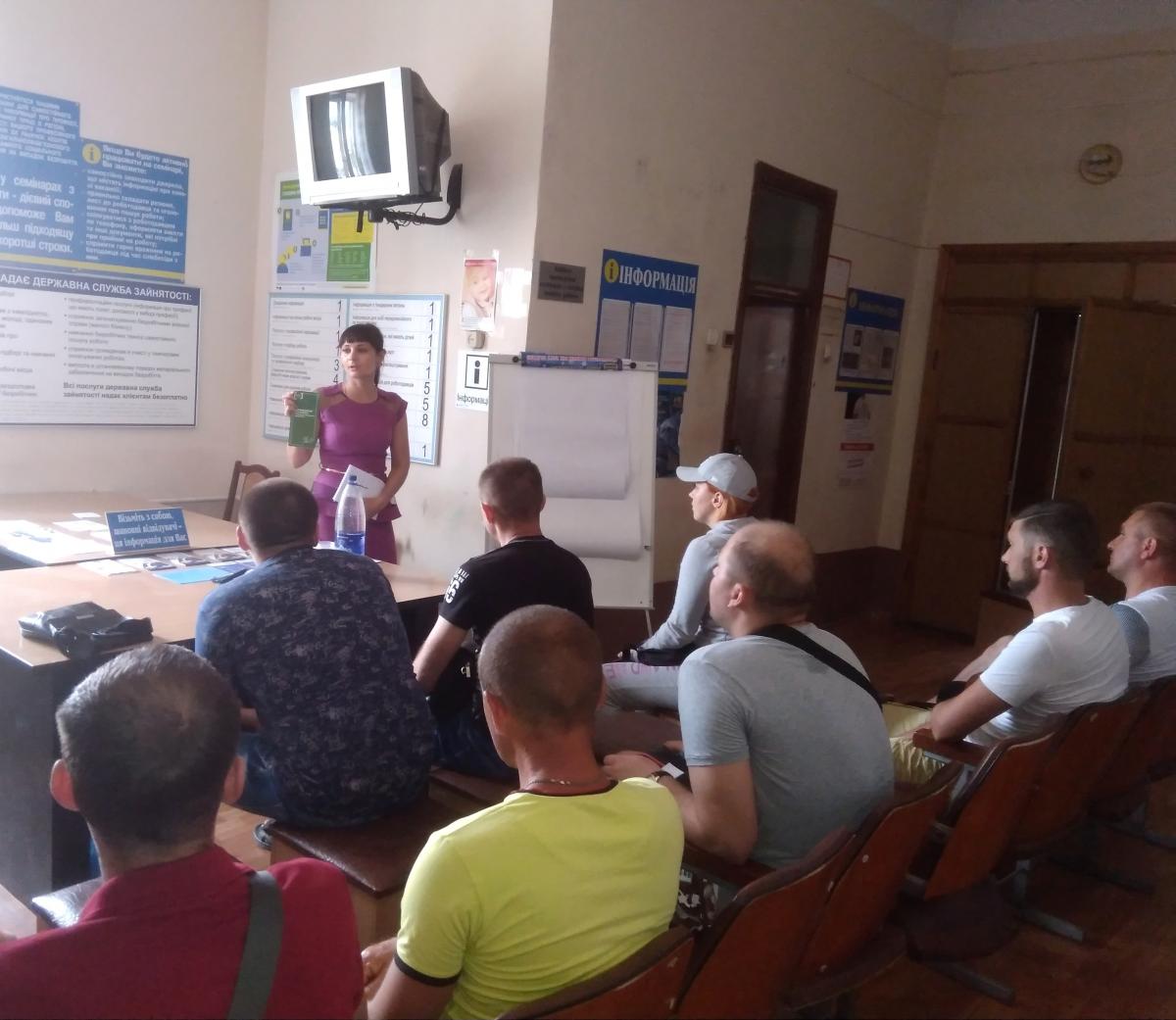 Фахівець з профорієнтації центру зайнятості Ірина Пасішна розповіла про ситуацію на ринку праці міста та регіону, інформувала про соціальні послуги служби зайнятості щодо сприяння учасникам АТО у працевлаштуванні та підбору гідної роботи.