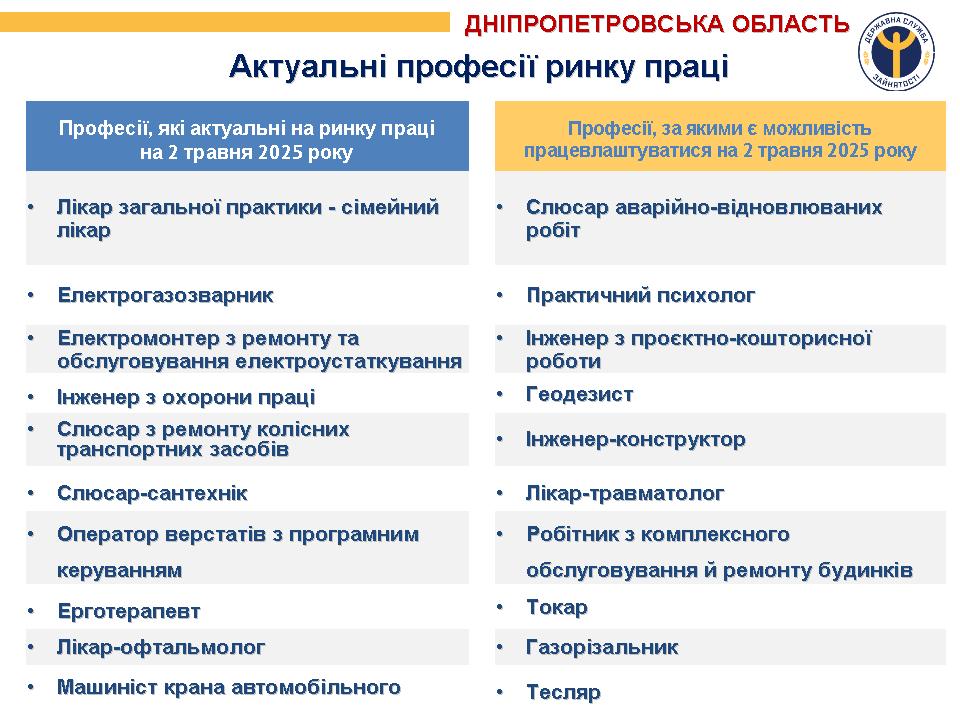 Наразі актуальні такі професії: лікар загальної практики – сімейний лікар, електрогазозварник, електромонтер з ремонту та обслуговування електроустаткування, інженер з охорони праці, слюсар з ремонту колісних транспортних засобів, слюсар-сантехнік, оператор верстатів з програмним керуванням, ерготерапевт, лікар-офтальмолог, машиніст крана автомобільного.